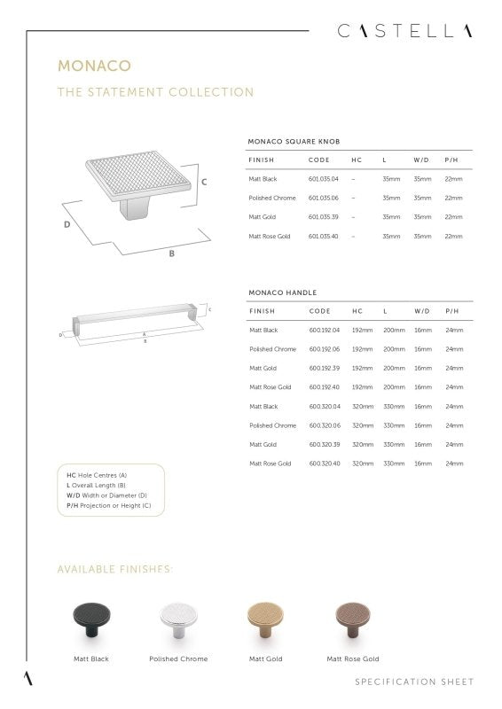 Castella Monaco Cabinet Square Knob Handle