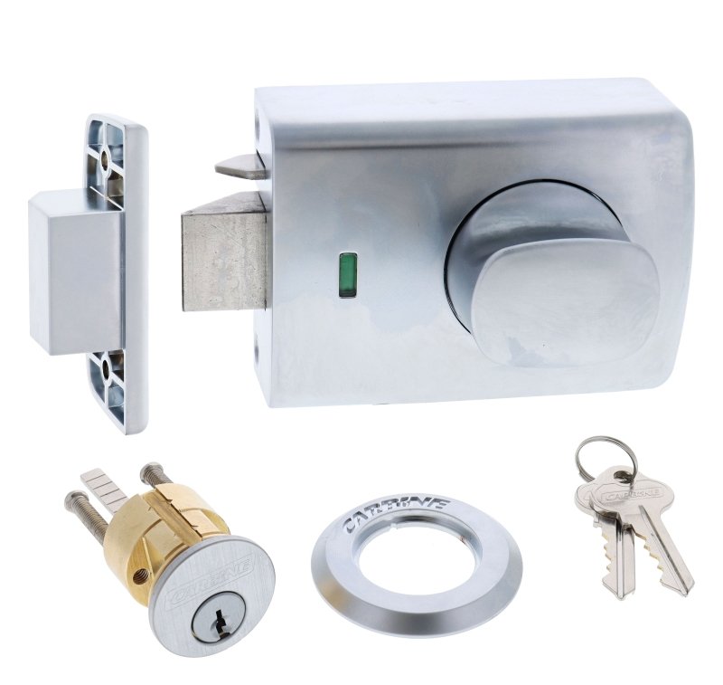 Carbine Alpha CRD-4K1 , Double cylinder deadlatch, Knob inside, Keyed to Differ , Openout strike, Satin Chrome, Boxed