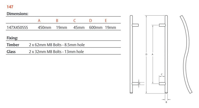 LOCKWOOD ENTRANCE PULL HANDLE 147X450SSS 450MM SATIN STAINLESS STEEL PAIR