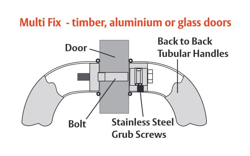 Packaging For Various Doors Each Lockwood Entrance Handle comes supplied with spigots to suit 10 - 12mm thick glass doors as well as aluminium and timber doors up to 50mm thick.