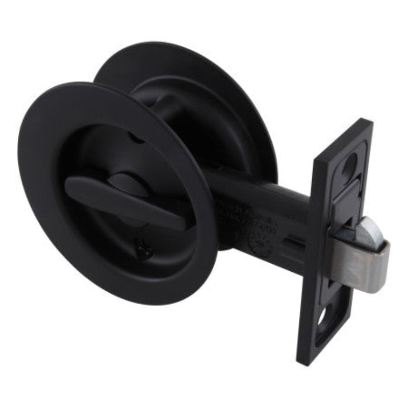 The Gainsborough Privacy Sliding Cavity Set Circular in Matte Black (395MBC) is a locking set designed for internal sliding doors that disappear into a wall cavity, typically for rooms where privacy is desired, such as a bathroom or ensuite.