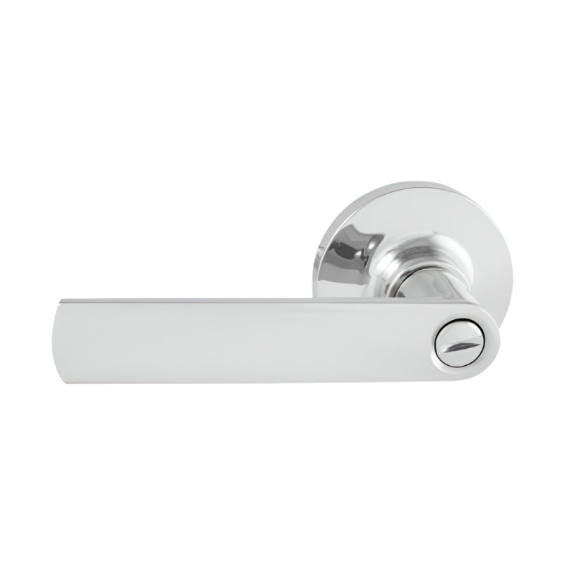 Gainsborough TradePro Bela Privacy Lever Set in Bright Chrome. Product Code: 1410PROBELBC. This privacy set is suitable for internal doors where privacy is needed, such as bedrooms or bathrooms. It features a contemporary lever with a flat profile and subtle curves, mounted on a 65mm round rose. The set has a sleek bright chrome finish.