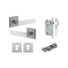 Package includes: lever handles, square rose backplates, spindle, fixings, tie bolts