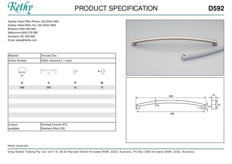The KETHY D592 Cabinet Arched Pull Handle is a stylish and functional hardware accessory designed to enhance the aesthetic appeal of cabinets and drawers. With a length of 288mm, this pull handle is crafted to provide a comfortable grip while adding a touch of sophistication to your furniture.