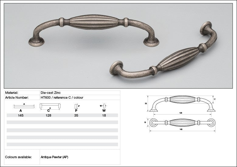 The KETHY HT600 Cabinet Ashford Solid Handle in Antique Pewter offers a timeless and elegant design suitable for various interior styles. Crafted with meticulous attention to detail, this handle showcases a robust construction and a classic silhouette that effortlessly enhances the aesthetic appeal of any cabinetry or furniture piece.