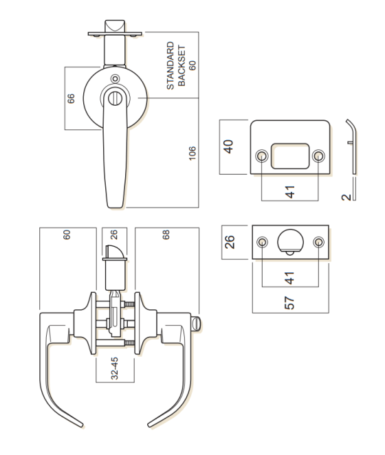The Bow series lever furniture lockset is designed for use with hinged timber doors to suit entrance, passage, privacy (bathroom) and dummy (wardrobe) functions.