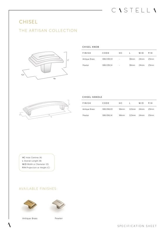 The Castella Artisan Chisel Handle brings refined Italian craftsmanship into your home. With its simple yet elegant design, it is the perfect choice for enhancing traditional kitchens, pantries, and cabinetry. Its understated charm and durable finishes make it both stylish and practical.