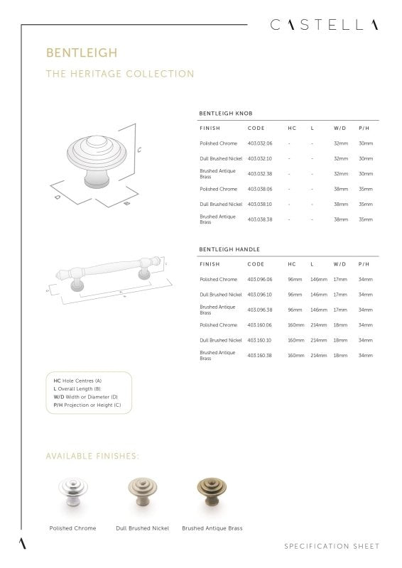 The Castella Bentleigh Cabinet Knob brings timeless Italian-inspired elegance to your cabinetry. With its classic design and refined finishes, it enhances both traditional and modern interiors. Ideal for kitchen cabinets, drawers, pantries, and dressers, this knob combines sophisticated style with practical functionality.