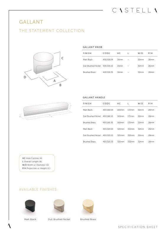 The Castella Gallant Cabinet Knob is a bold yet refined piece from the contemporary Statement collection. With its modern design and elegant finish, it adds a touch of understated luxury to kitchens, pantries, dressers, and other cabinetry. Perfect for both residential and commercial spaces, Gallant offers timeless style with contemporary sophistication.