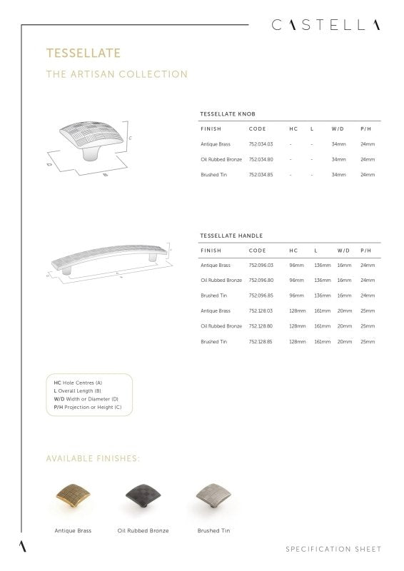 The Castella Geometric Tesselate Cabinet Handle is a Spanish-designed and crafted piece from the Castella Geometric Collection. Featuring a unique textured surface and antique-inspired finishes, this handle adds character and depth to cabinetry. Perfect for kitchens, dressers, pantries, and storage units, it complements bold geometric interiors with timeless style.