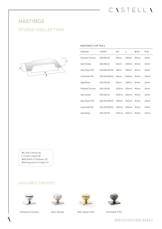 The Castella Hastings Collection in solid brass is characterised by smooth, refined curves that bring a timeless, classic look to cabinetry. Designed for both beauty and practicality, the Hastings 203mm Cup Pull Handle is perfect for shaker-style drawers and traditional interiors.