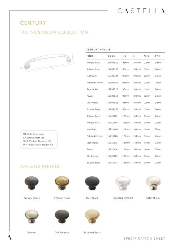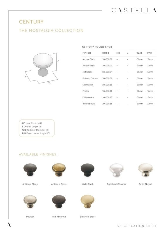 The Castella Nostalgia Century Round Knob offers a timeless Italian-inspired design, ideal for traditional and Hamptons-style cabinetry. Perfect for kitchens, pantries, dressers, and other storage, this classic knob combines elegance with everyday functionality.