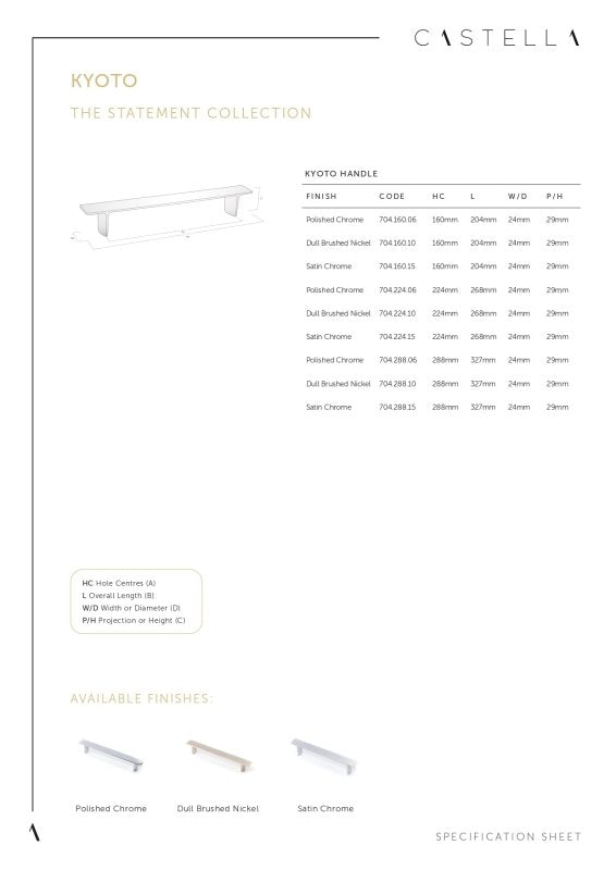 The Castella Statement Kyoto Handle, created by a renowned Spanish designer, blends industrial aesthetics with timeless style. Perfect for kitchen cabinets, drawers, and storage furniture, it delivers a bold statement in both modern and classic interiors.