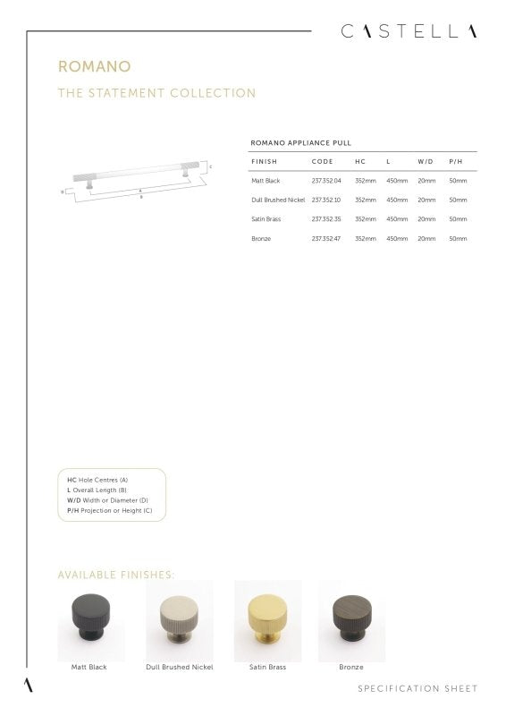 The Castella Romano Cabinet Pull Handle is crafted from solid brass with a linear knurled design inspired by the Roman Forum. Its bold detailing brings a touch of history and sophistication while maintaining modern functionality. Perfect for kitchens, bathrooms, wardrobes, and feature cabinetry.