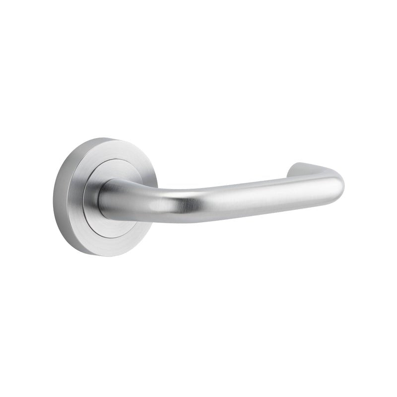 The Iver Oslo Lever Door Handle On Round Rose offers a refined and modern design that complements both residential and commercial interiors. Crafted from solid brass, it combines style, strength, and durability, providing a sleek architectural look with reliable performance for daily use.