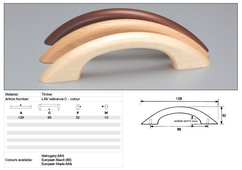 KETHY L49 CABINET TIMBER BOW HANDLE 96MM