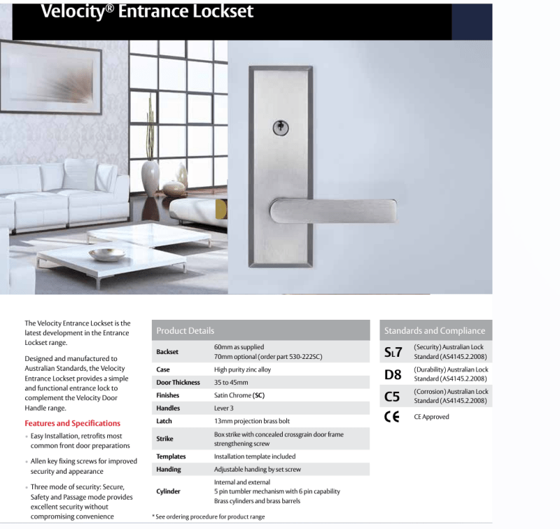 The Velocity Entrance Lockset is the latest development in the Entrance Lockset range. Designed and manufactured to Australian Standards, the Velocity Entrance Lockset provides a simple and functional entrance lock to complement the Velocity Door Handle range. Features and Specifications