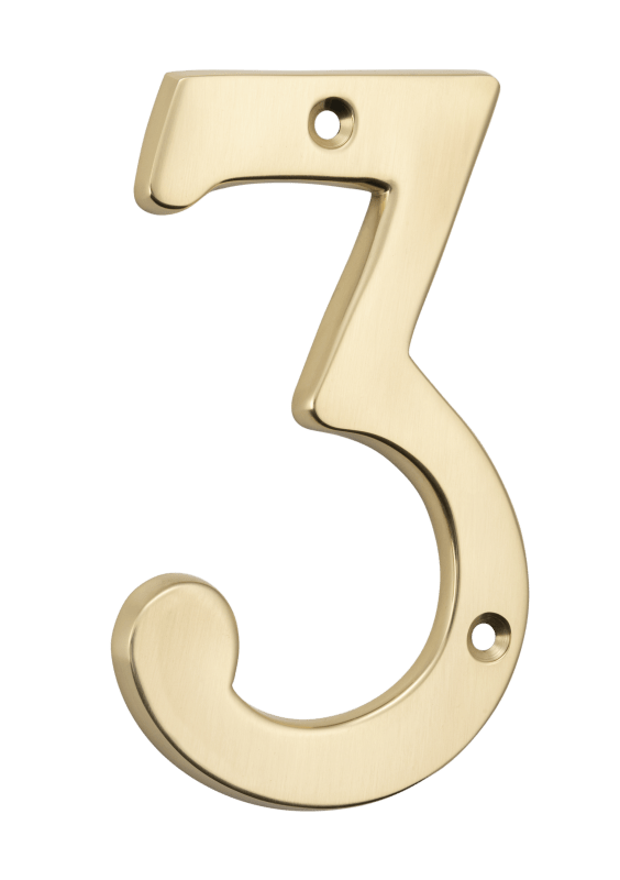 The numeral "3" is intricately formed, featuring a polished brass construction that exudes a warm and inviting glow. The polished brass finish not only adds a touch of luxury but also ensures durability, making it resistant to tarnishing and corrosion. The high-quality materials and craftsmanship make it suitable for both interior and exterior doors, providing a lasting and tasteful solution for your address or room numbering needs.